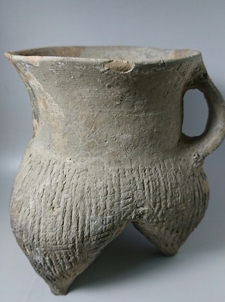 灰陶单把鬲,其造型为日常炊饮器具,分裆式袋状足,以刻划线为装饰,这件陶鬲高约13mm,胎体较薄,刻划纹是在装饰的基础上也起到加固的作用